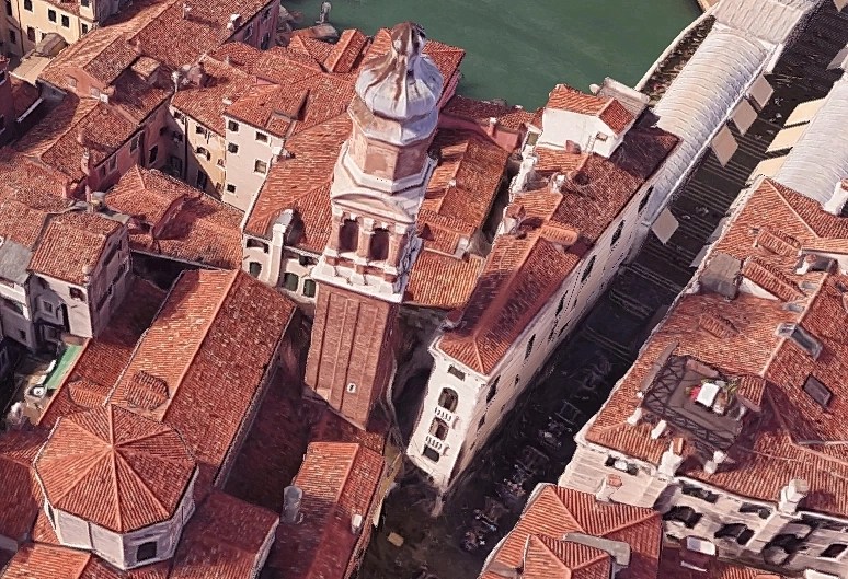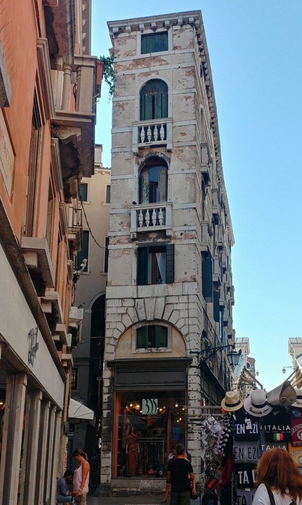 La domanda di rito, immancabile, è sempre la stessa: “Ci passa almeno un letto?”. E in effetti, impressiona quanto sia stretto questo palazzo, entrando in Salizzada Pio X con il Ponte di Rialto sullo sfondo. La sua esile larghezza, accentuata dalla notevole altezza, dà l’impressione che possa piegarsi al primo soffio di vento. In realtà, la stabilità è garantita dal lato opposto, dove la struttura raddoppia la sua larghezza.