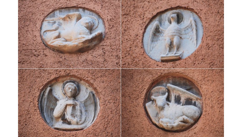 Le quattro figure sono incastonate a diverse altezze e, partendo dall’alto, si riconoscono i simboli tradizionali: