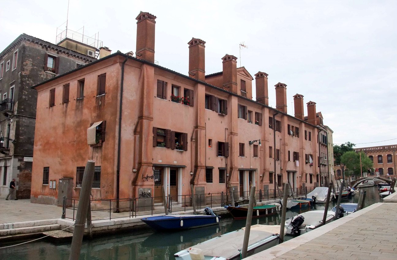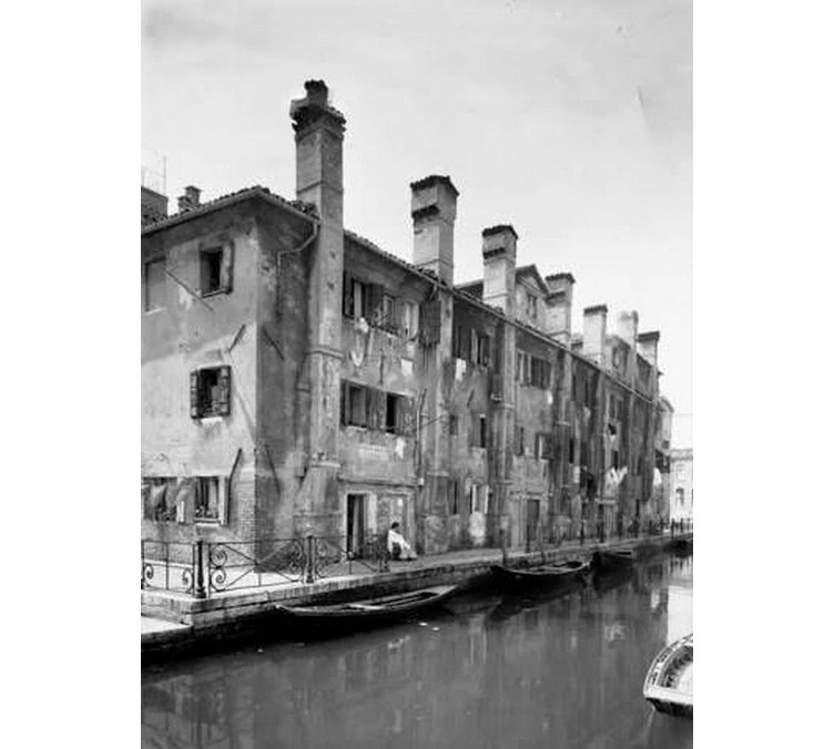 La Casa dei Sette Camini fu costruita nel Settecento come abitazione popolare. Sul finire dell’Ottocento, ospitò anche i lavoratori del vicino Cotonificio Veneziano, uno dei più importanti stabilimenti tessili della città, attivo dal 1883 fino alla sua chiusura negli anni ’60. L’edificio, situato nel sestiere di Dorsoduro, si distingue per la sua semplicità architettonica, ma presenta una caratteristica unica: sette camini perfettamente allineati lungo il lato che affaccia sul canale, ciascuno con la propria canna fumaria esterna.