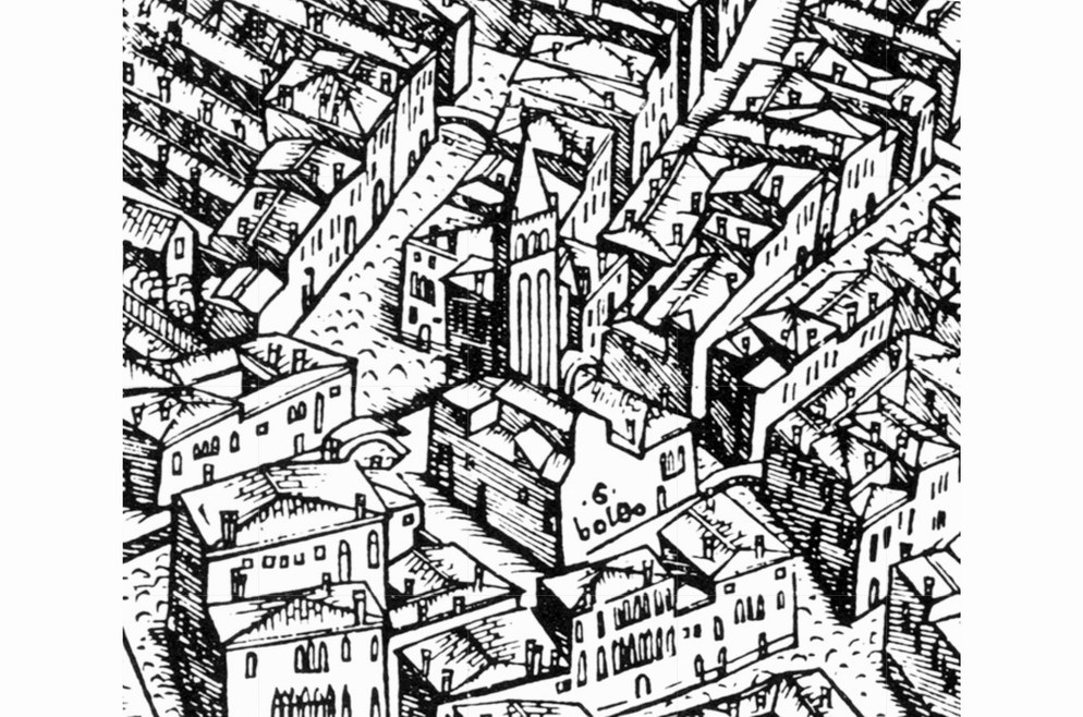 il Campanile con la Chiesa di San Boldo e Palazzo Grioni come erano nel 1500