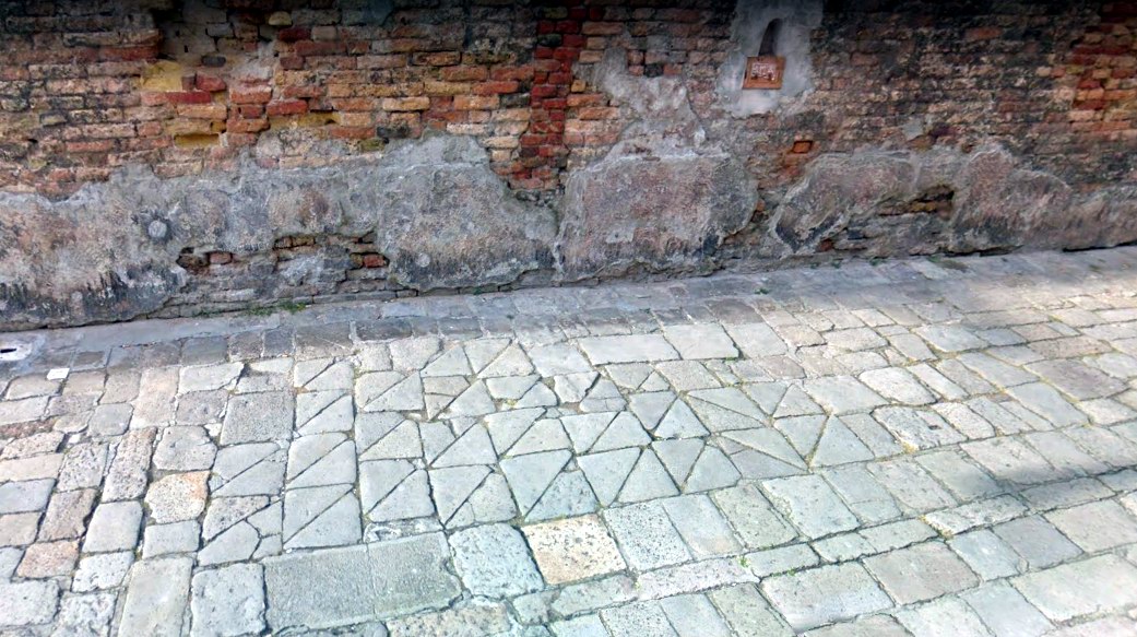 Ma in questa calle accade qualcosa di insolito. In alcuni tratti, la forma rettangolare lascia spazio a masegni più schiacciati, quadrati, di dimensioni variabili. E poi, all’improvviso, compaiono masegni triangolari: una geometria rara, unica, che non si riscontra altrove in città.