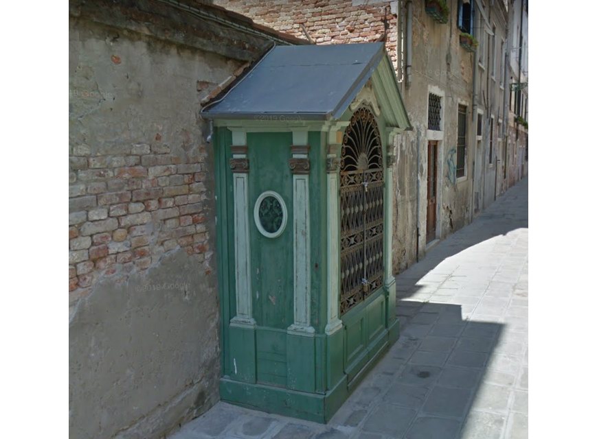 E invece, ci si trova davanti a un unicum veneziano: un antico capitello a forma di tempietto, interamente dipinto, in legno, poggiato a terra e sporgente dal muro. È dedicato a Sant’Antonio da Padova, e sotto il timpano una scritta ne ricorda l’anno di costruzione: 1668.