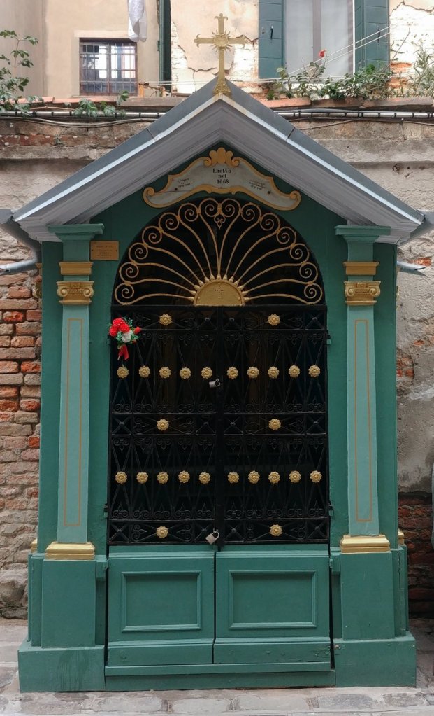 L’immagine sacra è protetta da un fitto cancelletto a due battenti, che sembra custodire non solo la figura, ma anche la memoria. Si narra che un tempo vi fosse un ritratto del Santo dipinto dal Tintoretto, che abitava poco distante, appena oltre il ponte.