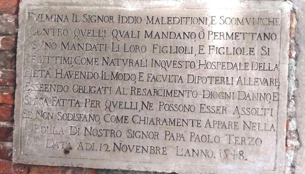 Nel 1548, come ricorda una lapide posta sulla Chiesa della Pietà, non lontano dalla Ruota degli Innocenti, la speciale porta attraverso cui i neonati venivano abbandonati in forma anonima, si cercò di porre fine a un abuso sempre più diffuso: l’abbandono di figli anche da parte di chi non era in reale stato di necessità. Per scoraggiare simili comportamenti, si fece appello persino all’ira divina: