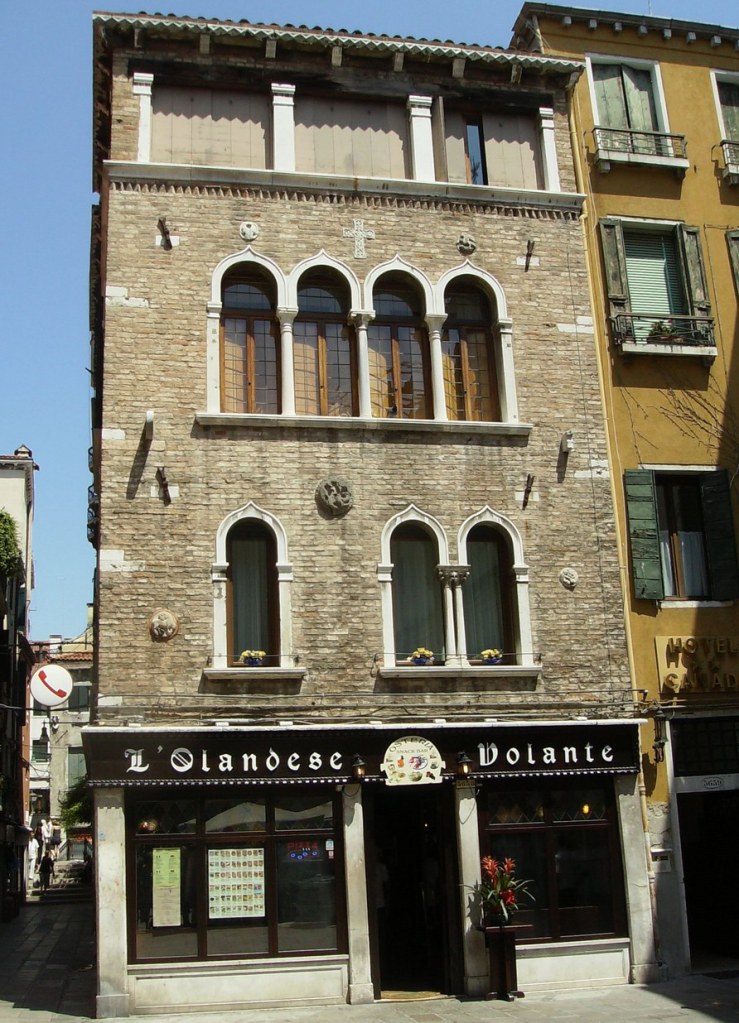 Su questo antico palazzo, sotto la quadrifora del secondo piano, si trovano due piere sbuse: una intera a sinistra, l’altra spaccata a destra. Su quest’ultima sono visibili alcuni fori, probabilmente realizzati per fissare la parte rotta. Una riparazione eseguita più per ragioni estetiche che strutturali, dal momento che, una volta ricomposta, non avrebbe potuto sostenere grandi sforzi, tant’è che oggi non è più presente.