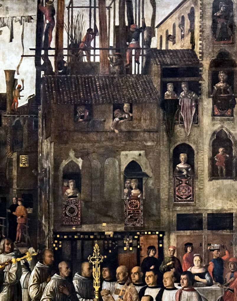 Sono pochissimi i dipinti che raffigurano edifici con piere sbuse, e nessuno degli edifici rappresentati è giunto fino a noi. In questo caso, però, ci troviamo davanti a una situazione curiosa e, se vogliamo, inversa: il palazzo in questione è raffigurato nel dipinto Miracolo della reliquia della Santa Croce in Campo San Lio del 1496, opera di Giovanni Mansueti, ricca di dettagli architettonici. Tuttavia, le piere sbuse oggi visibili non compaiono. Una svista? O la prova che non erano ancora presenti?