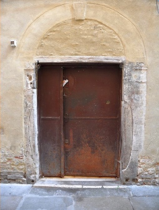 Ci troviamo a circa 100 metri in linea d’aria sia dalla Riva del Vin, dove un tempo si scaricavano le botti di vino per il controllo da parte dei dazieri, sia dalla Calle dei Botteri, sede storica della costruzione di botti per olio e vino. In questo punto, una porta si distingue nettamente dalle altre per la forma insolita dei suoi montanti: nella parte inferiore, infatti, sono stati scavati per ampliare sensibilmente la larghezza utile, superando i 150 cm. Considerando che in passato ogni dettaglio architettonico aveva una funzione ben precisa, si ritiene che questo fosse un deposito per botti, e che tali allargamenti servissero a far passare anche quelle di dimensioni maggiori.