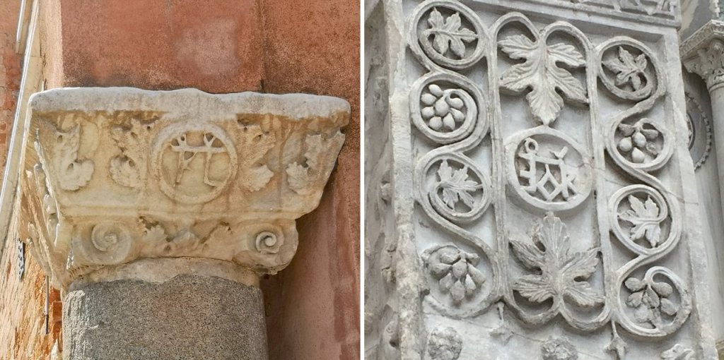 Curiosamente, questo simbolo ricorda quelli incisi sui celebri Pilastri Acritani, posti accanto alla Cattedrale di San Marco. Questi ultimi, di origine siriaca e risalenti al VI secolo, sarebbero stati trafugati da San Giovanni d’Acri nel 1256 e portati a Venezia.