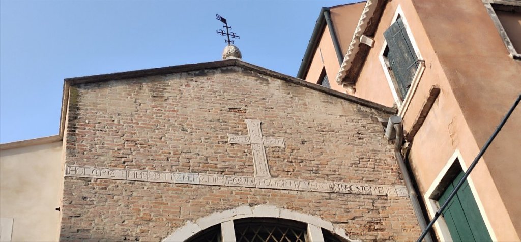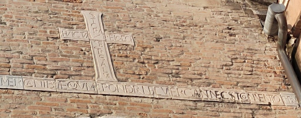 Sull’abside esterno della Chiesa di San Giacomo di Rialto si trova un abbinamento curioso: due iscrizioni in latino, una racchiusa in una croce e l’altra in una striscia sottostante. La prima, all’interno della croce, è rivolta all’anima e alla spiritualità, quindi perfettamente coerente con il luogo sacro. La seconda, invece, è rivolta all’esterno, al mondo del commercio, e per comprenderla appieno è necessario contestualizzarla.