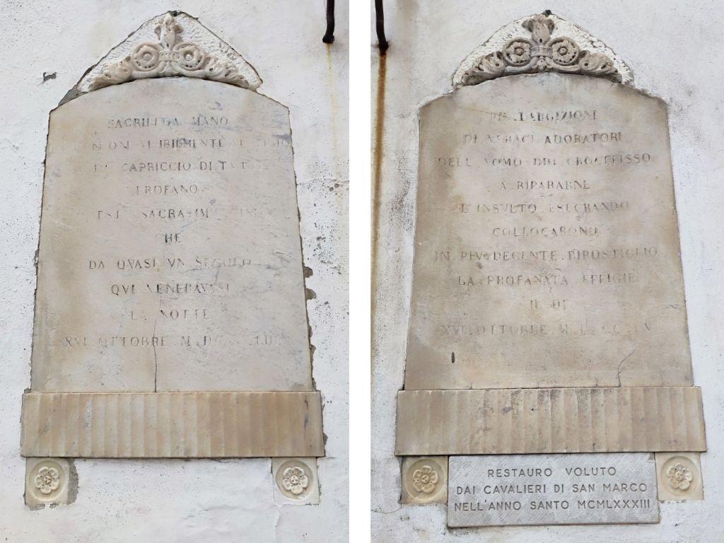 Nonostante alcune parole illeggibili, le iscrizioni rivelavano chiaramente che su quel muro era venerata una “sacra immagine” o “effigie” fin dal 1750 circa. Profanata nel 1853, fu sistemata nel 1855 grazie a pie donazioni e ricollocata in un “più decente ripostiglio”: il capitello stesso. Ma il crocifisso, dove era finito?