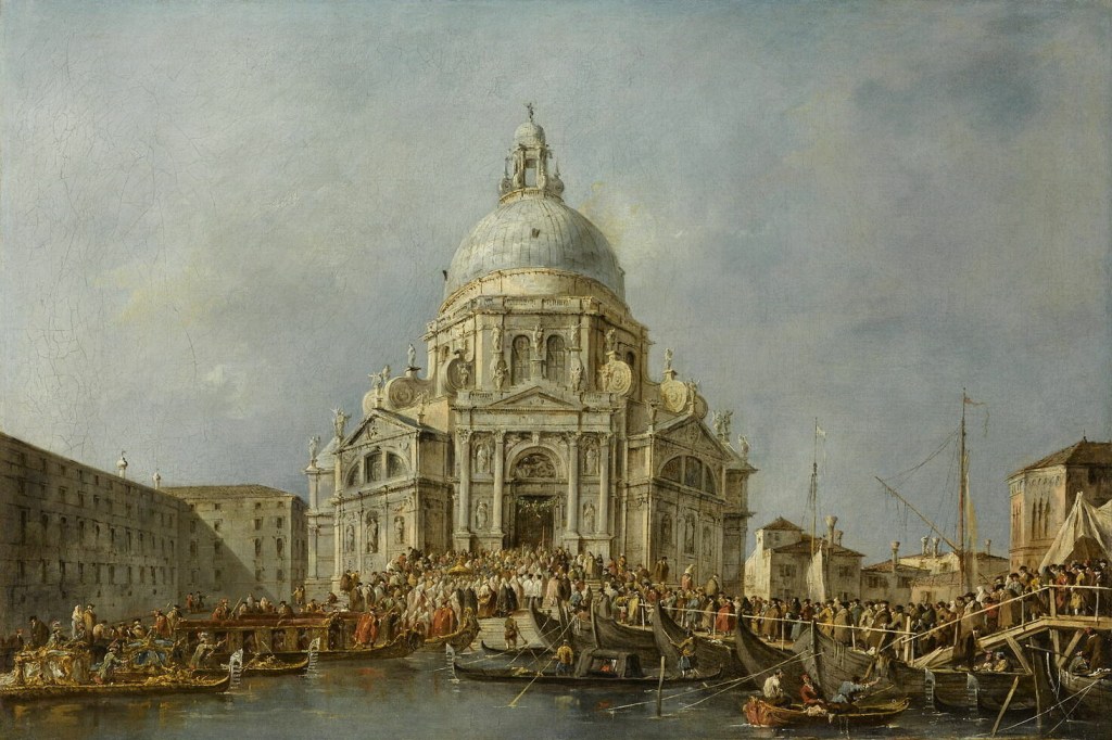 “Il doge Alvise IV Mocenigo alla Basilica di Santa Maria della Salute a Venezia” realizzato da Francesco Guardi tra il 1766 e il 1770