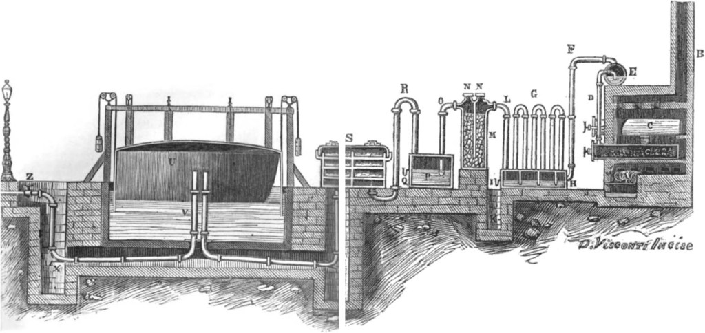 Il gas veniva prodotto attraverso la distillazione del carbone fossile in forni ermetici. Una volta purificato, era immesso dal basso nelle grandi campane metalliche rovesciate, immerse in vasche d’acqua che fungevano da sigillo idraulico. Man mano che il gas affluiva, le campane si sollevavano lungo i binari esterni, espandendosi per accogliere il volume crescente. Durante il consumo cittadino, le campane scendevano lentamente: il loro stesso peso esercitava la pressione necessaria a spingere il gas attraverso i tubi fino ai lampioni e alle abitazioni. L’altezza raggiunta dalle campane era, di fatto, un indicatore visivo immediato della riserva energetica della città.
