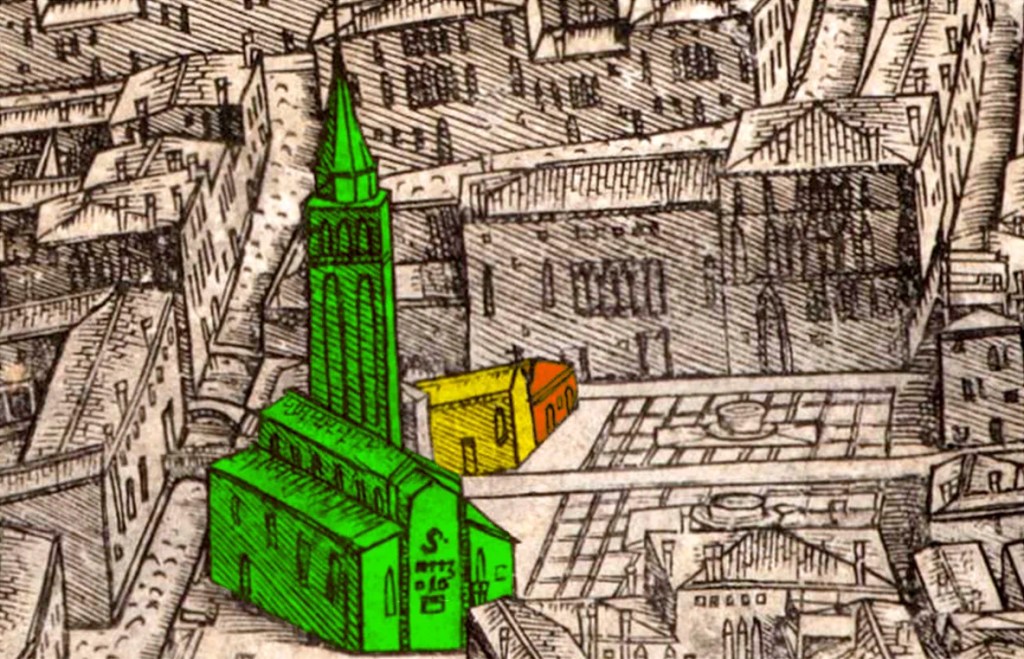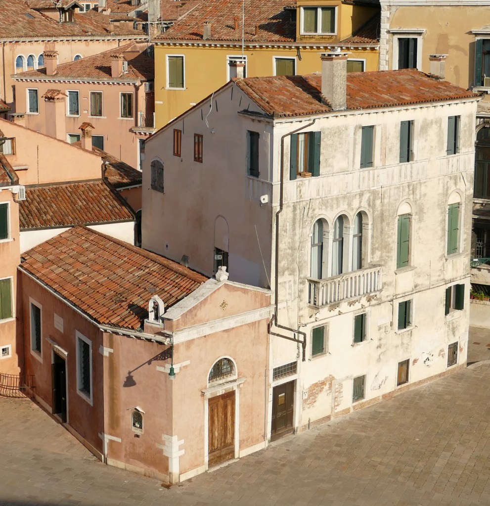 Un indizio significativo arriva dalla celebre mappa a volo d’uccello di Jacopo de’ Barbari del 1500, la prima rappresentazione di Venezia con una simile prospettiva. Se la veduta è fedele, il palazzetto appare allora come una casa più bassa dell’oratorio. Questo sposterebbe l’innalzamento dell’edificio a un’epoca successiva, quando il periodo “classico” delle piere sbuse (XII–XIII secolo) era già concluso da tempo. In altre parole, il fatto che la piera sbusa risulti più antica dell’edificio indicherebbe un riuso.