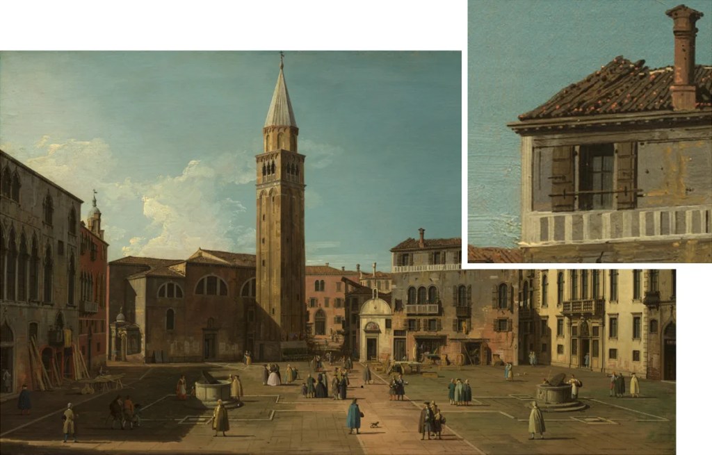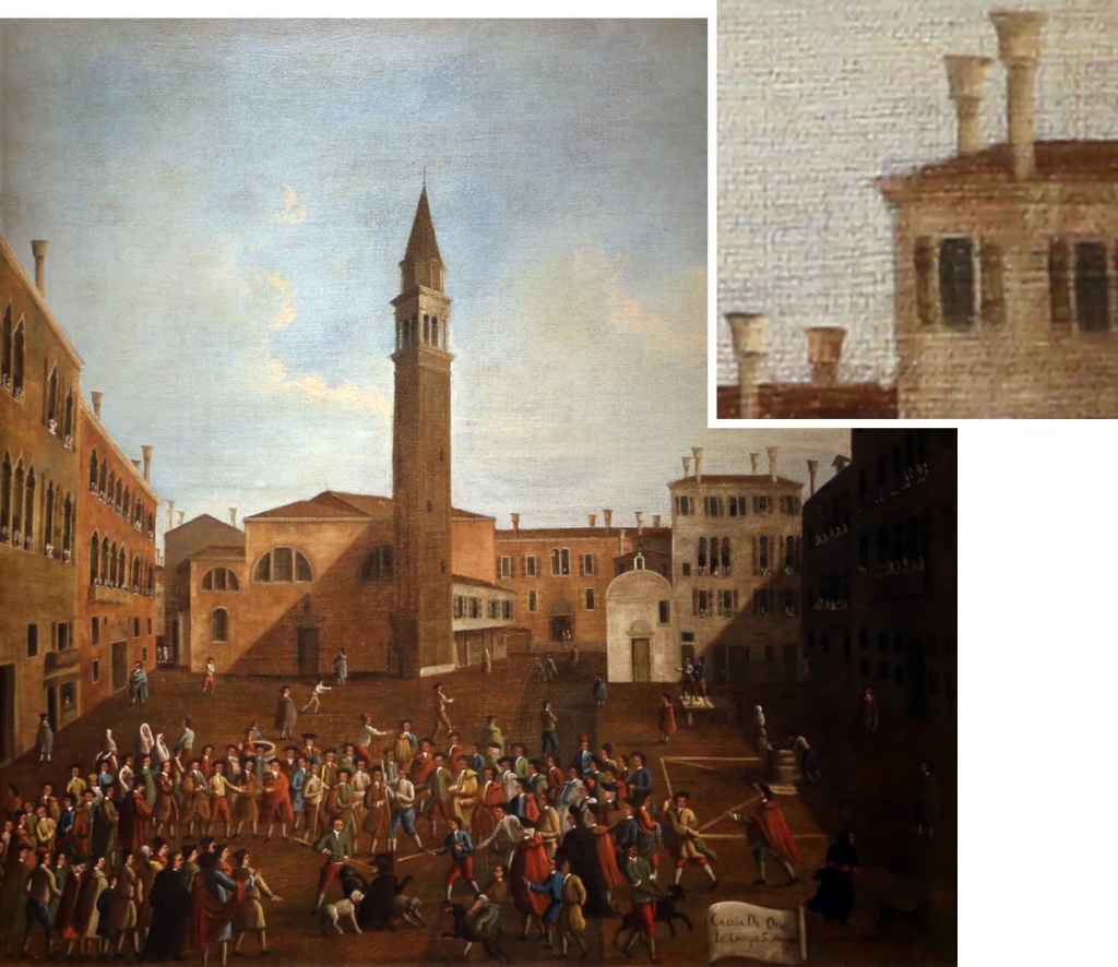 Nessun aiuto arriva invece dai due dipinti settecenteschi che raffigurano il palazzetto: uno del Canaletto e uno di Gabriel Bella. In entrambi, la balconata risulta già murata, ma il dettaglio della piera sbusa (che da quella prospettiva dovrebbe intravedersi almeno un poco) non è reso con sufficiente definizione da permettere di stabilire se fosse già presente.