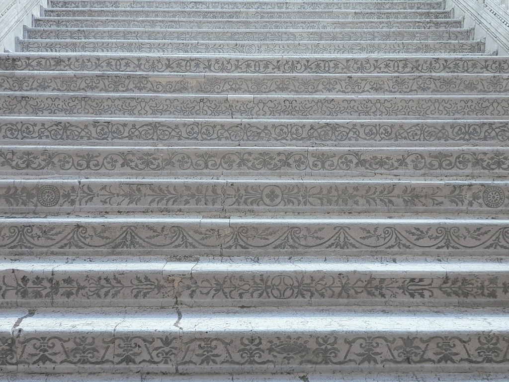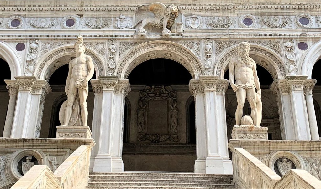 Sulla sommità, come due guardiani eterni, si ergono Marte e Nettuno, scolpiti da Jacopo Sansovino nel Cinquecento. Il primo incarna la forza militare della Serenissima, il secondo il dominio sui mari. Insieme formano una coppia simbolica che racconta l’ambizione di Venezia in quell’epoca: potenza di terra e potenza d’acqua.