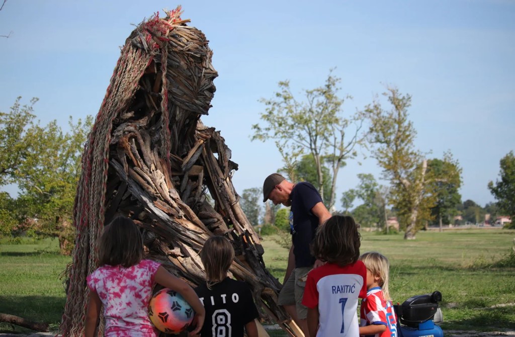 Con la stessa tecnica, ma con un’anima diversa, è nata “La Custode”. Silenziosa e raccolta, l’opera veglia sull’Isola della Certosa dall’ottobre 2020. Per realizzarla sono stati utilizzati frammenti lignei provenienti dalla bonifica dell’isola stessa, oggi il parco urbano più esteso di Venezia, con un tocco d’ingegno marittimo: le sue chiome sono fatte di vecchie cime dei vaporetti, logore e ingiallite, perfettamente coerenti con lo spirito del riutilizzo.